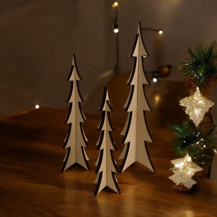 Skab en hyggelig og stilren jul med disse dekorative juletræer i træ, designet i et enkelt og moderne nordisk udtryk. Træerne er fremstillet i smukt træ og passer perfekt som pynt på julebordet, i vindueskarmen eller som en del af en hyggelig juleudsmykning. Med deres minimalistiske design bringer de naturens ro ind i hjemmet og kan bruges år efter år som bæredygtig julepynt.
