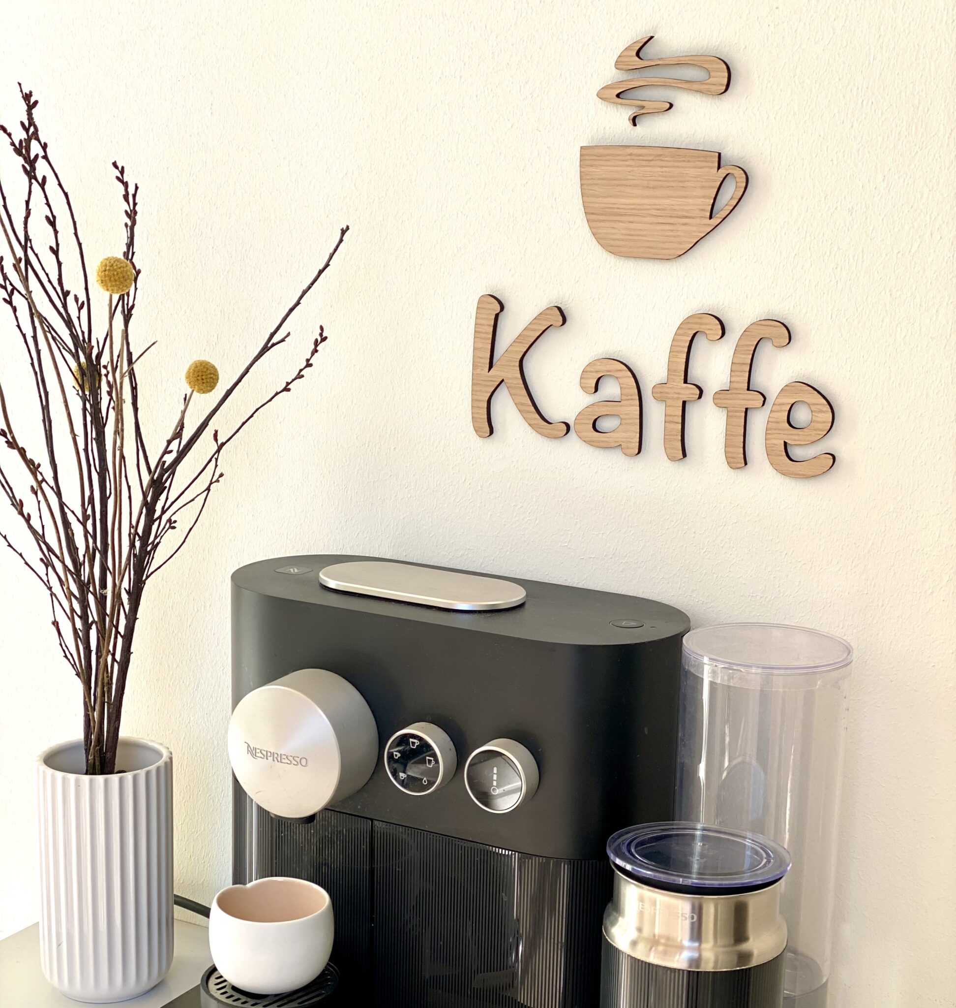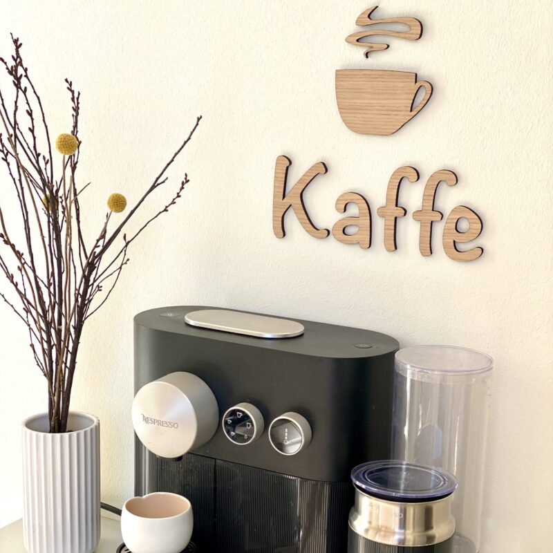 Kaffe skiltet kan bestilles i tre typer træ. Lys eg, Valnød og Røget eg