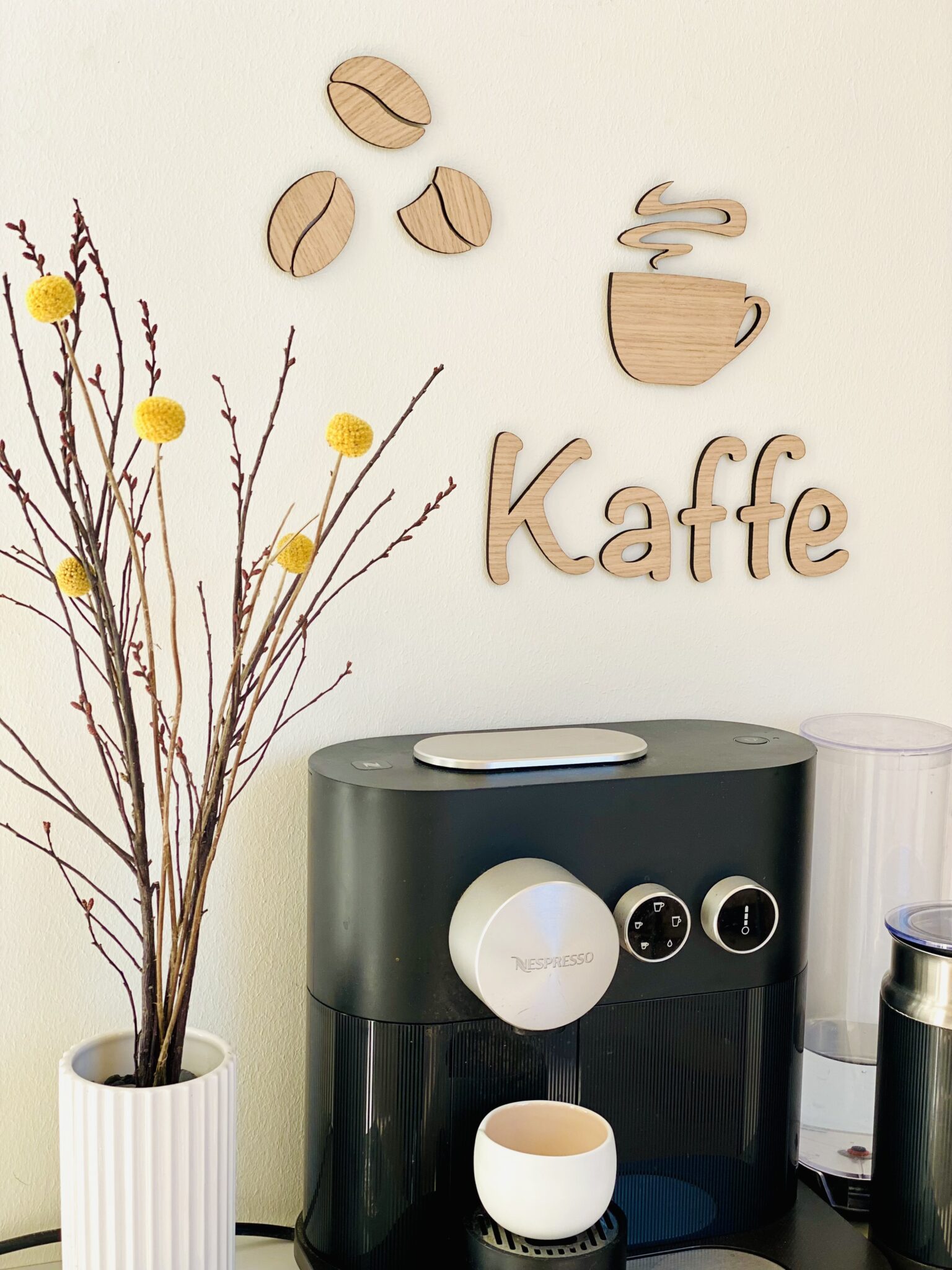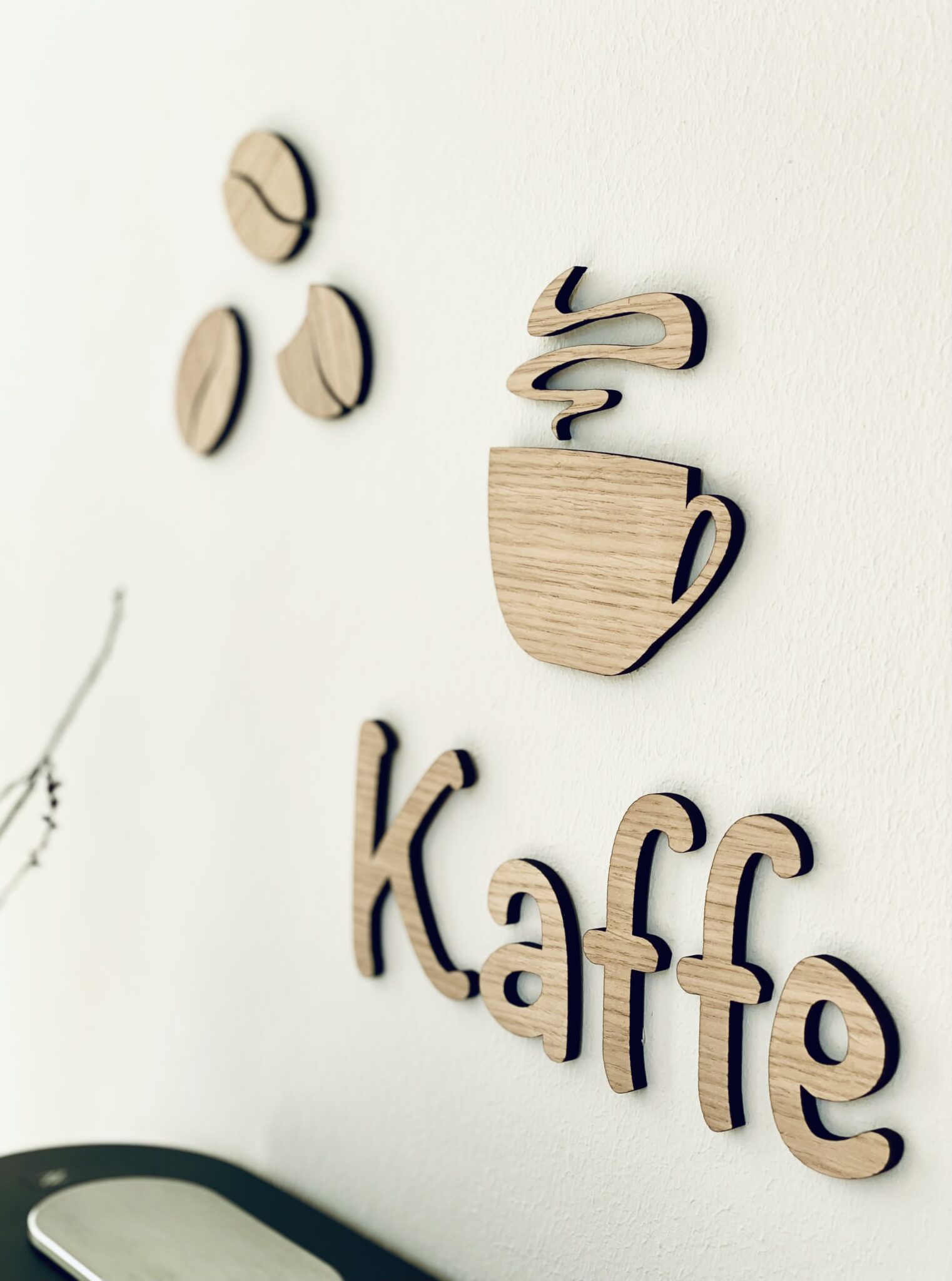 Sættet indeholder bogstaverne samt kaffekop med damp og tre dekorative bønner.