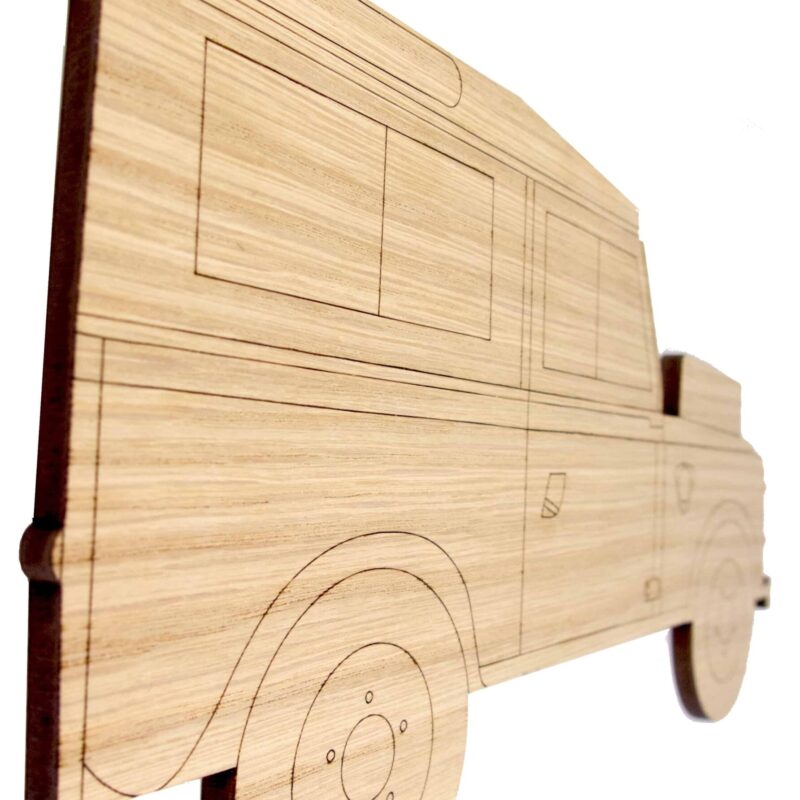 Landroveren måler: b 28 cm, h 15 cm og er fremstillet i lækker 6 mm egetræsfinér.