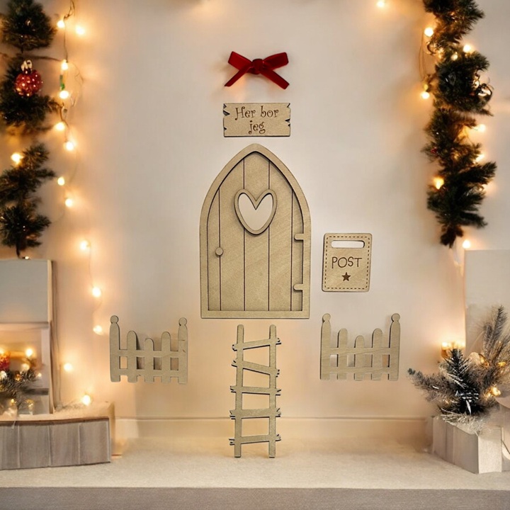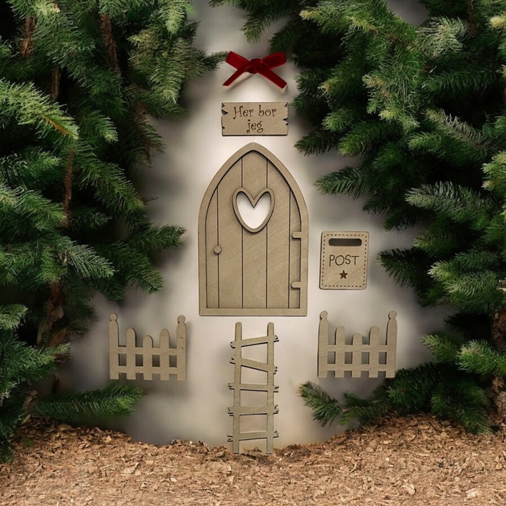 Indeholder: Nissedør, stige, hegn, postkasse og skilt – alt til et hyggeligt lille nissebo.