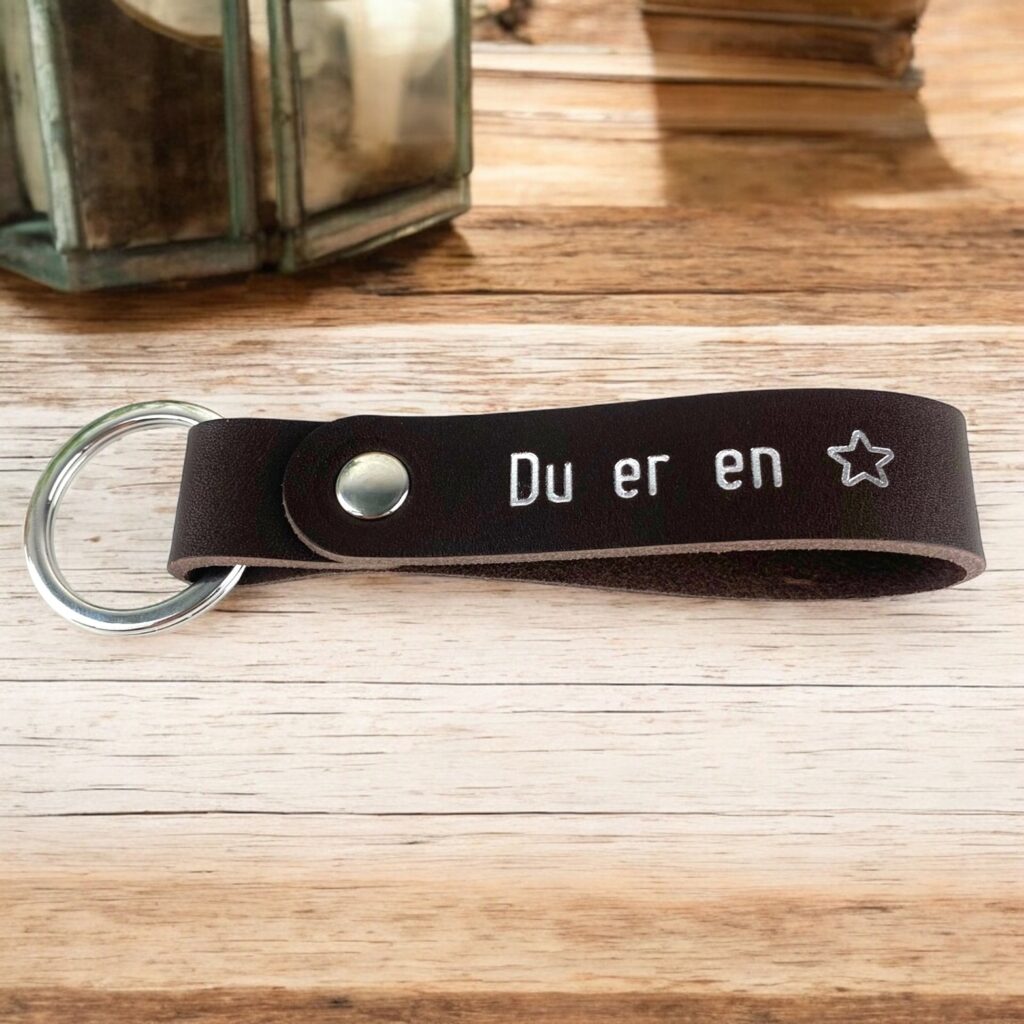 Perfekt som en personlig gave til en ven, kæreste eller forælder, eller som en stilfuld tilføjelse til dit eget nøglebundt. Bestil din nøglering i brun læder med personligt tryk i dag, og tilføj et elegant og personligt præg til dine nøgler.